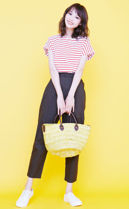 レッドのボーダートップスに、ブラックのアンクルパンツを合わせた