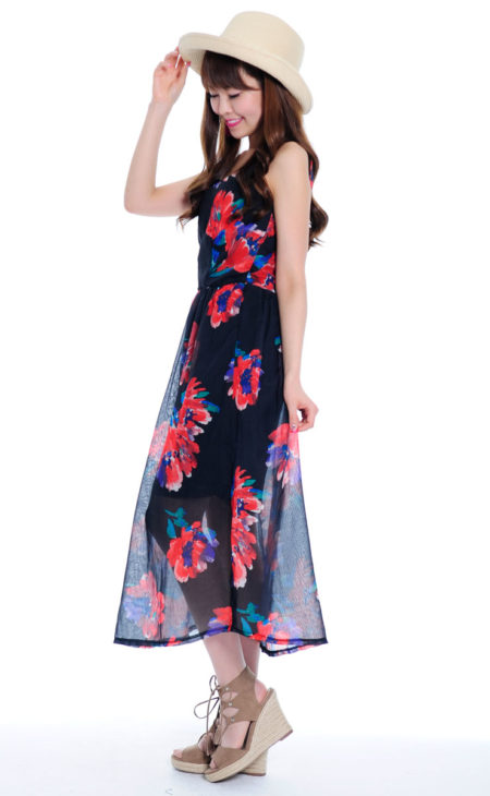 ブラックに鮮やかな花柄が映えるマキシワンピースです![]()